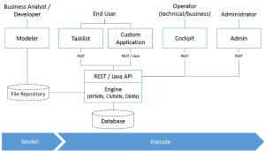 کاموندا یک پلتفرم مبتنی بر جاوا است و برای گردش کار و اتوماسیون فرآیند از نمادگذاری BPMN، برای مدیریت پرونده ها از CMMN و برای مدیریت تصمیم گیری کسب و کار ازDMN پشتیبانی میکند. در این مطلب اطلاعاتی در مورد ویژگی های ارائه شده توسط پلتفرم Camunda BPM گرد آوری شده است. تصویر زیر برای نمایش کلی کاموندا (Camunda)، مهمترین مؤلفه ها و برخی از نقش های یک کاربر معمولی را نشان داده است.